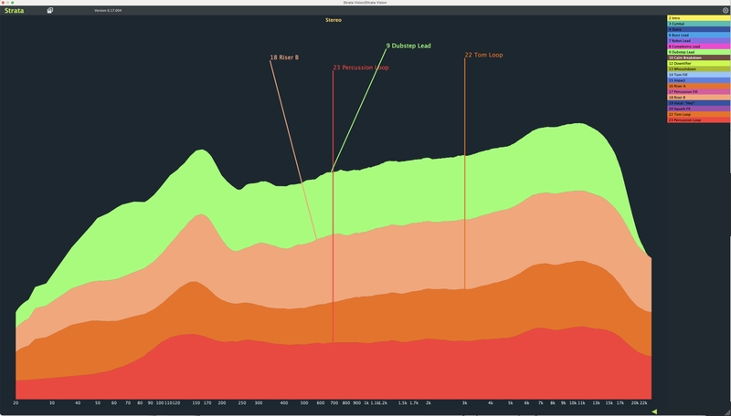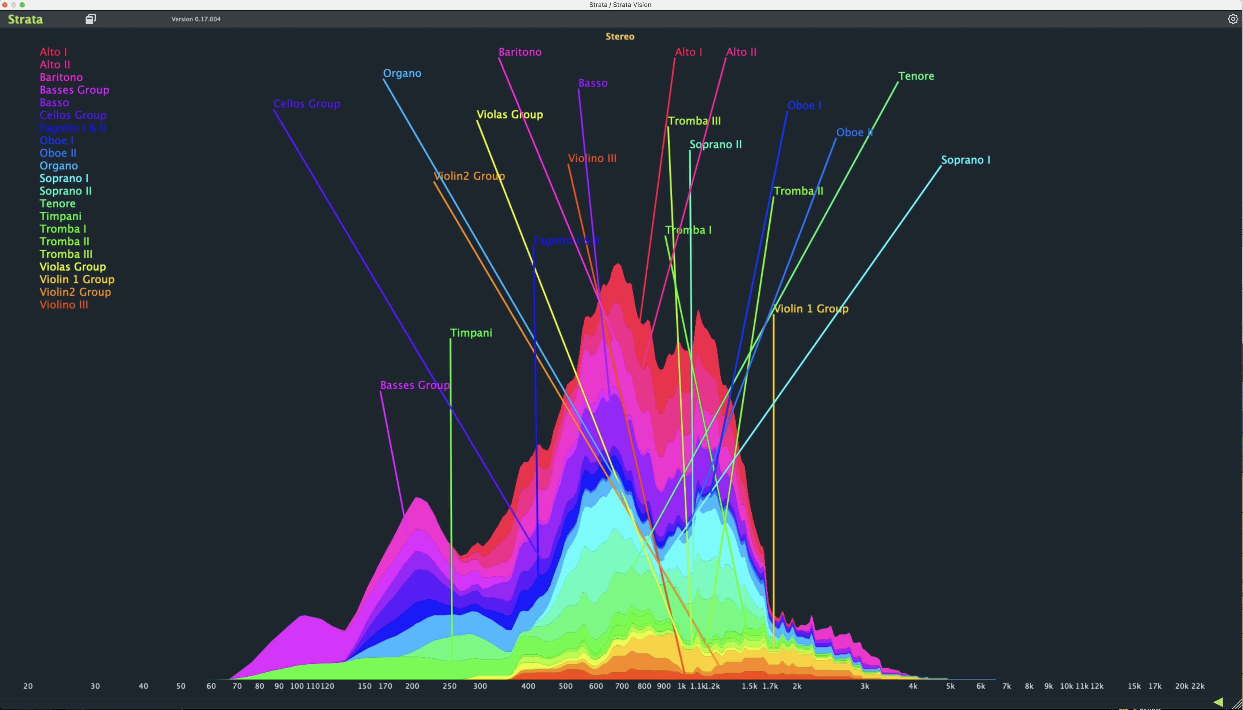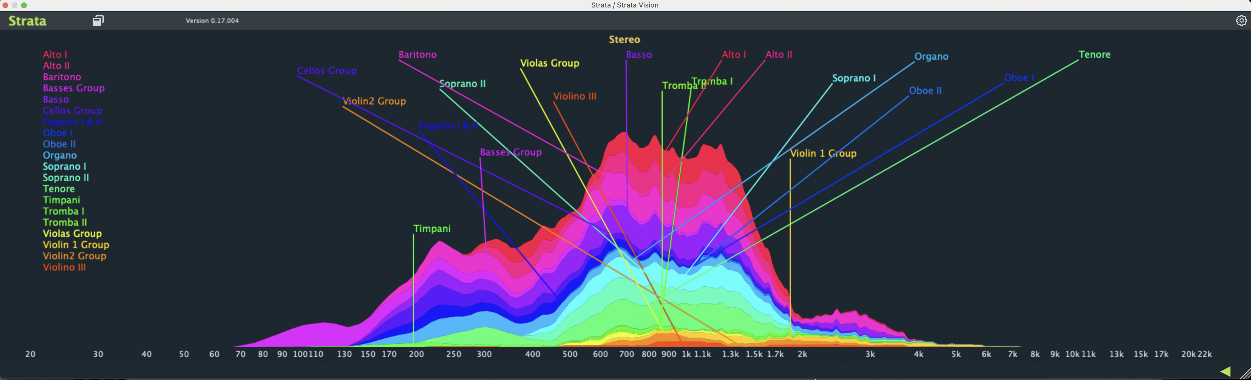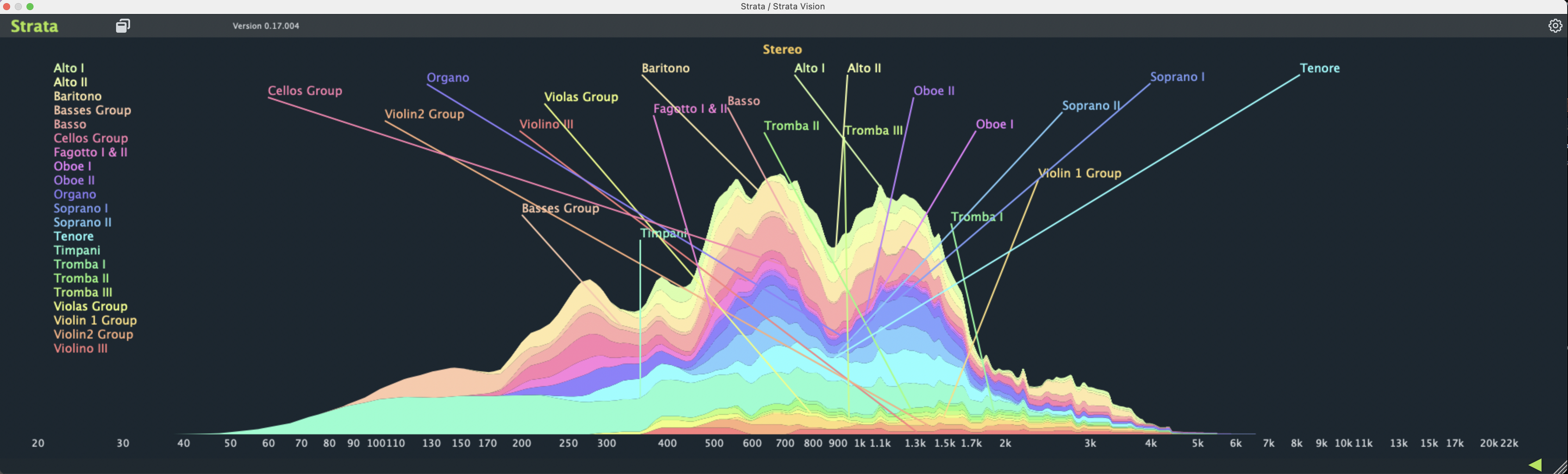 This snapshot of Strata Vision is from a Bitwig project rendering the orchestral choral work "Zadok The Priest". As you can see, there are lots of instruments and it can get a bit busy. But Strata still copes with all this and you can see the volume relationships between all the tracks very clearly.